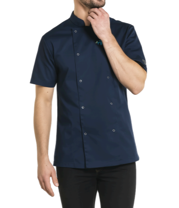 Koksbuis met korte mouw De stof is praktisch en voelt prettig aan. Deze uitstekende allrounder is afgewerkt met zichtbare metalen RVS drukknopen. Rechte pasvorm Pennenzak YKK Flex Fix drukknopen
