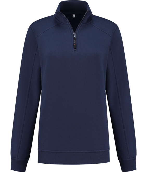 Zipsweater, French terry met geruwde binnenzijde, ladies fit, opstaande ribkraag met korte YKK Vislon rits, mouw met ribmanchet en tailleband in 1x1 rib.