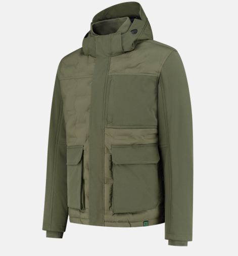 Het puffer jack heeft een comfortabele ribkraag in de hals. Ook de manchetten zijn voorzien van een ribmanchet. De capuchon heeft een uitsparing aan de zijkant voor extra zicht en is volledig afneembaar middels drukkers. Met de verdekte koordstopper kun je de capuchon verstellen. Aan de binnenkant van de werkjas zit een uitneembare rib windvanger met antislip elastiek. De onderkant van de werkjas is verstelbaar middels het koord aan de binnenzijde. Er zijn voldoende opbergmogelijkheden: twee binnenzakken, borstzak met rits en de zakken op het voorpand hebben zowel aan de boven- als aan de zijkant een ingang die ook afsluitbaar is. Vanwege de puffer look is er op het linker voorpaneel en het achterpand gebruik gemaakt van constrast softsell, zodat je de werkjas kunt bedrukken.